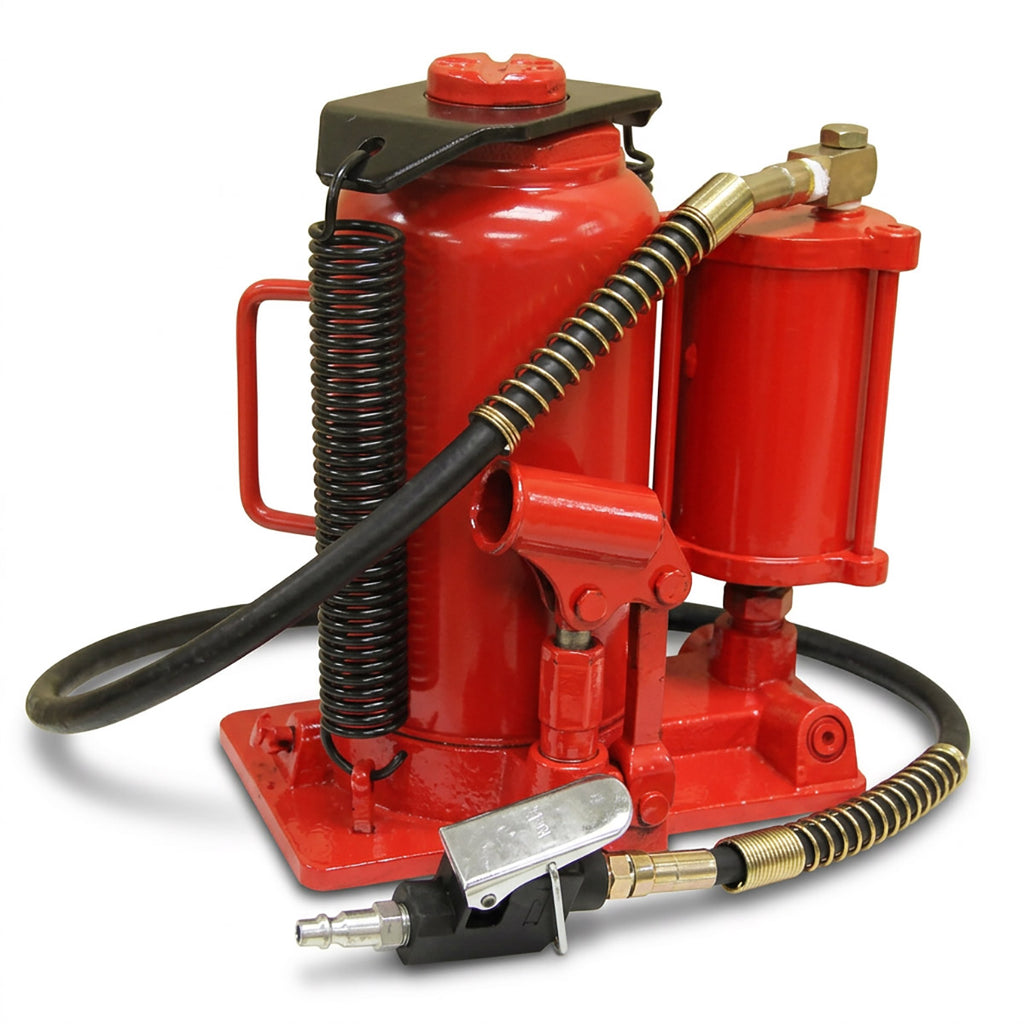 This 20-Ton Air/Hydraulic Bottle Jack is constructed of high-grade steel and built to exacting standards for quality and durability. The high-quality, large diameter hydraulic steel cylinder unit results in lower oil pressure needed to raise the load. A built-in bypass device protects the hydraulic system from over-pumping damage.